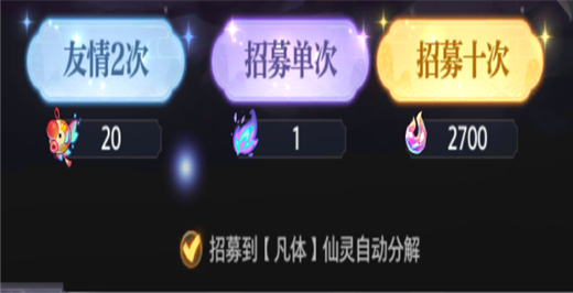 1、抽取规则:普通招募消耗月华灵叶或者灵玉,可以选择单次招募和招募十次(十连抽)。友情招募消耗友情点,10点/次。每次抽取除了会获得随机的仙灵之外,还将获得1点祝福值和1点宝箱值。