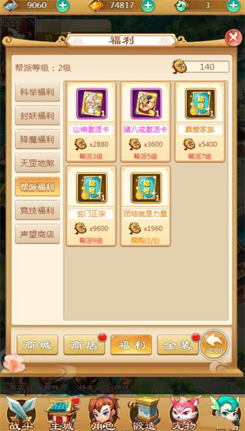 3、帮派福利。加入帮派好处多多,帮派等级的提高可以在帮派福利里面消耗帮贡兑换称号及宠物,所以不要吝啬对帮派的贡献哦~