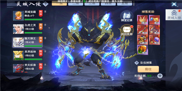 一、玩法概述灵域入侵为跨服玩法,通过击败灵域入侵boss,获得珍贵的圣装奖励。等级越高的首领,掉落高品质的奖励越高。