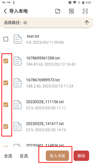 3、选择需要导入的文档,点击“导入书架”完成导入。