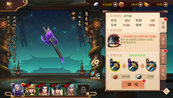 开启专属系统后,所有武将都可以通过锻造获得专属武器。丙将和乙将有通用武器,而甲级武将则拥有各自独特的专属武器,每一把武器都有其独特的造型。