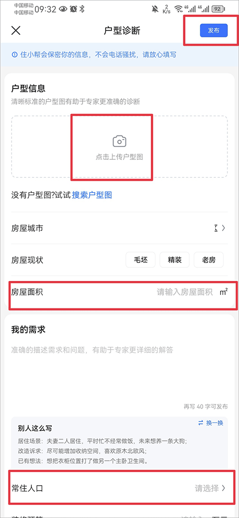 3、进入后点击上传户型图,同时填写户型面积、需求、常驻人口、装修预算等信息,完成后点击右上角发布即可。