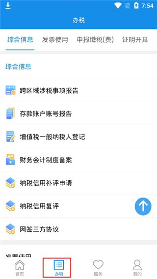 2. 办税版块提供“我要办税”功能,方便用户处理基础涉税业务,如发票使用、申报缴税、证明开具等。