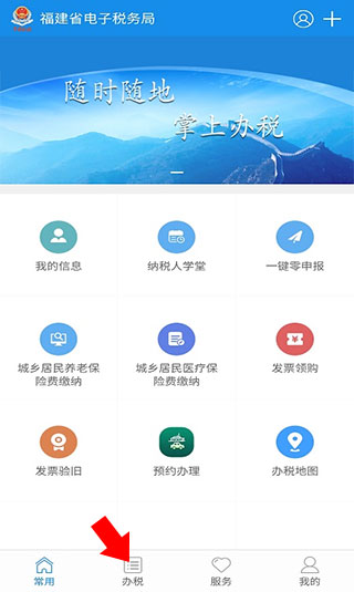 1、下载并打开app,点击下方导航栏中的办税按钮;