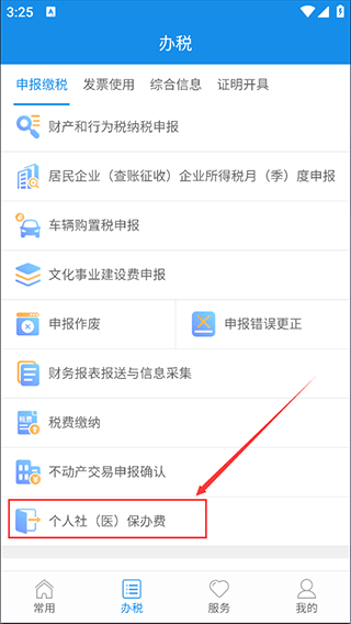 2、在【办税】页面下滑,找到【个人社(医)保办费】选项;