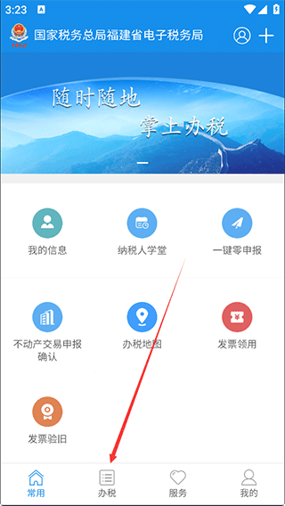 1、在福建税务app官方版中,点击下方菜单栏的【办税】进入相应页面;