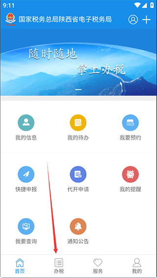 1、首先在本站下载并登录陕西电子税务局应用,然后点击屏幕下方的【办税】功能;