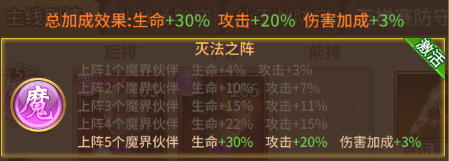 选择全魔界伙伴上阵可以获得生命值增加30%、攻击力增加20%以及伤害加成3%的显著奖励,这一阵容加成明显倾向于输出型。