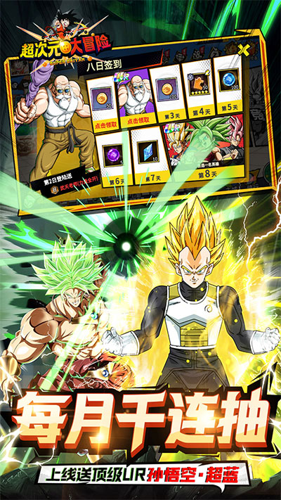 3、登录即可获得8级Z战士、10万充值额度、顶级UR孙悟空·超蓝、百连抽和超赛材料包等福利。