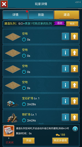 点击屏幕左侧的蓝色建造图标,进入建造界面,玩家可以查看详情并建造建筑。