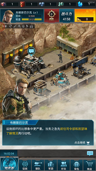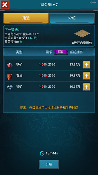 点击主界面中心的司令部,进行司令部升级,升级后可解锁更多建筑。