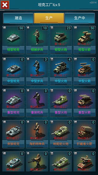 点击屏幕左侧的蓝色生产图标,进入坦克工厂界面,生产坦克、步兵、火炮和火箭,提升部队实力。