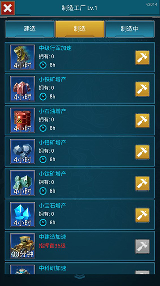 点击屏幕左侧的蓝色制造图标,进入制造界面,进行资源生产和制造。