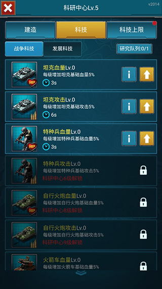 点击屏幕左侧的蓝色科技图标,进入科研中心,提升坦克和特种兵等部队的等级,增强战斗力。