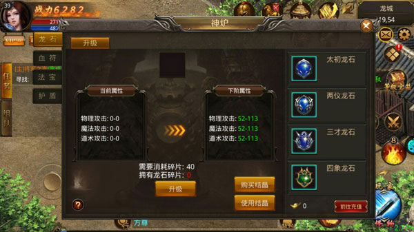 神炉需要龙石碎片消耗,增强物理、魔法和道术攻击力,是战力提升的关键。
