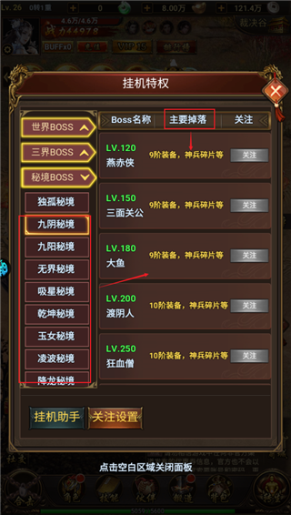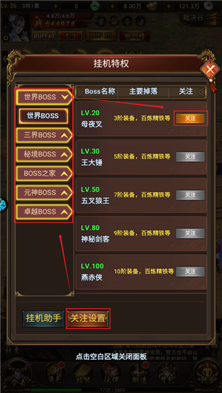 2、挂机前先要关注boss,选择你要打的boss的所在区域,然后点击关注;