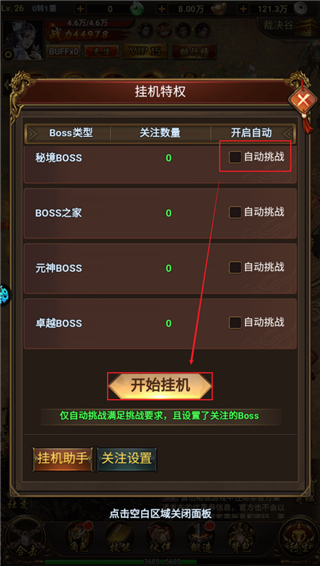 3、再回到挂机助手,勾选自动挑战-开始挂机就可以自动打boss升级爆装备了;