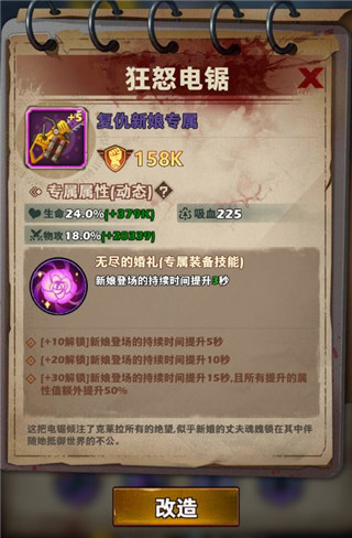 获取专属将提升复仇新娘的新娘登场持续时间,强化专属将获取额外的加成。