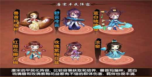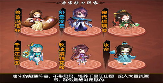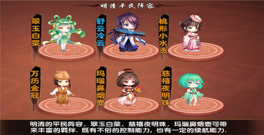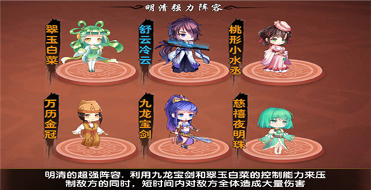 游戏中一共有4个阵营英雄选择,玩家可以在游戏初期就选定一个阵营进行集中培养,打造自己的最强阵容战力,同个阵营的英雄会触发羁绊,增加超强战力,下面给大家普及一下游戏内明清阵营的搭配建议:唐宋篇
