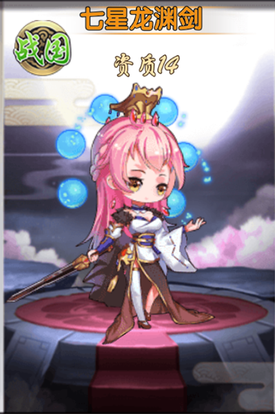 游戏中的七星龙渊剑是一个持剑英勇的"花木兰",身边有6颗类似能量球的圆形物体,郁郁发呆的眼神仿佛有什么难忘的心事。