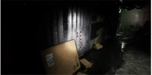 沿着地面的黄色电线行走能找到出口,走进房间后,可以在桌上发现一个盒子,
