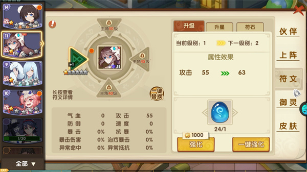 升级和提升每个角色的符文,进一步强化角色的战斗能力。