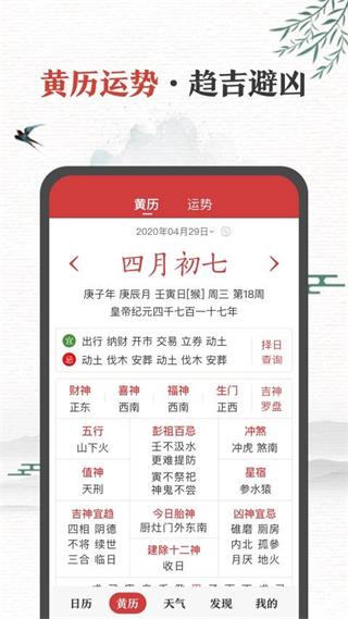 2、黄历--切换至黄历页面,可以查看当日黄历和运势;