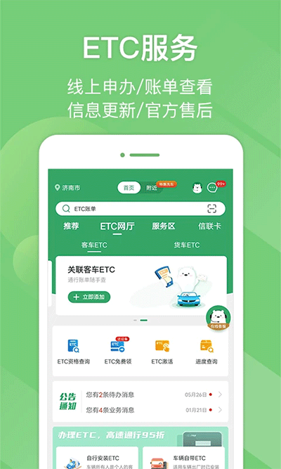 e高速app,亦称山东e高速,是一款专为高速公路出行而设计的手机应用软件。该应用能够全面解决用户在使用ETC时遇到的各种业务问题,如ETC的申办、安装指导、充值、异常监测、账单查询、通行费发票申领、解绑与挂失、以及售后服务等,旨在为您的出行提供更加流畅的体验。