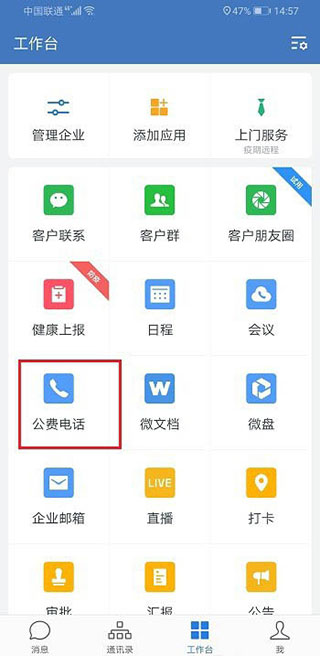 2、打开软件,点击公费电话,选择要拨打的电话。