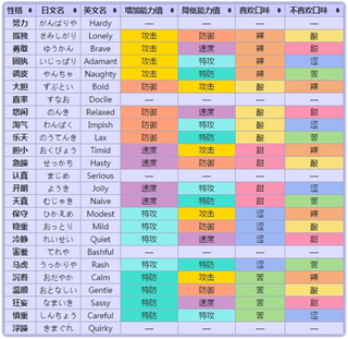 性格是小小精灵官方版游戏中一个重要的概念,它由特定的性格值定义。每种精灵都可以拥有25种不同的性格,具体包括在下表中。性格通常会影响精灵的两项能力值——一项增加10%,另一项减少10%。有5种性格不会影响能力值(但不会影响经验值和个体值)。性格还决定了精灵的口味偏好,不影响能力值的性格也不会改变口味。从心金魂银版开始,性格影响的能力值增减会用红色和蓝色进行标记。