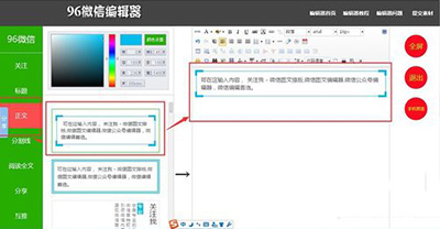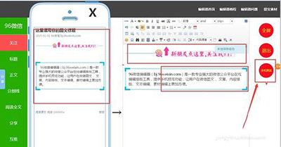 1、打开96编辑器手机版界面,界面分为四部分,最左侧为素材导航,包含微信公众平台关注素材、标题、正文、分割线、阅读全文、分享等类别;