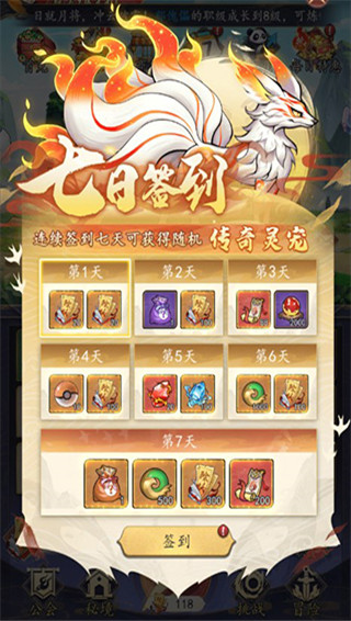 玩家可以点击上方的签到图标,即可进入七日签到页面,连续七天,每日签到都可以领取丰富的礼包,在第七天的时候可以领取到一个随机传奇灵宠。