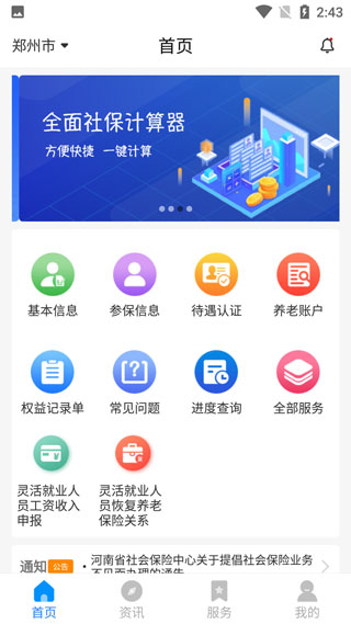 2、首页集成了常用功能,包括基本信息查询、待遇资格认证等。