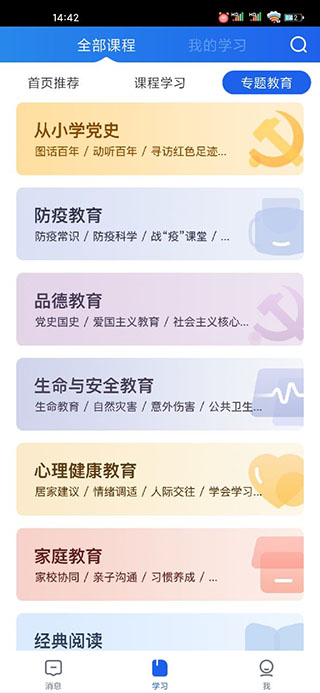 4、“专题教育”涵盖了包括防疫、影视、经典阅读、品德、研学、家庭教育及心理健康等多个领域。