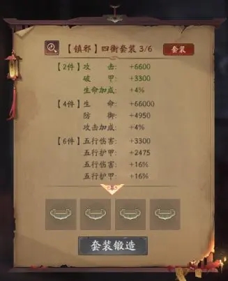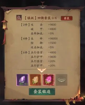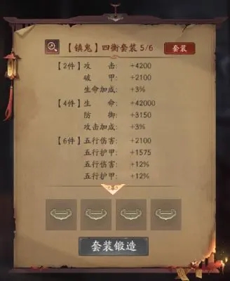 套装锻造、洗练 套装锻造分三个阶段:镇鬼套装 → 镇邪套装 → 镇妖套装。(装备打造为更高级高转主题套装后,同件数套装只生效最高级高转套装效果)。