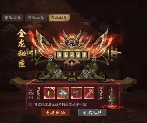 淬骨玉露获取途径:1.宝钻商城每周限购10个;2.名帖商城每日限购10个;3.每天金条限购10个;4.帮派活动——恶鬼蚀天。 小铃铛悄悄提醒道友们:“神寂古城中组队协助其他道友通关,每通关一次可得1000名帖值哦!” 帮派玩法 帮派福利之帮派密匣 帮派每天可以免费领取一次密匣。密匣品质分为蓝色、紫色、橙色和红色,品质越高,打开获取的奖励越好。可以请求其他道友帮助刷新为红色密匣。密匣密码:每位道友拥有系统随机给出的某一位数密码,可求助帮派成员,获取密匣的其他位密码。