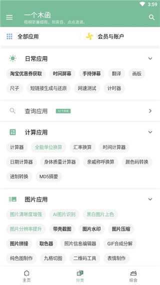 一个木函旧版本,由上海花筏科技有限公司推出,是一款轻巧而功能全面的实用工具集app。这个2017年的经典版本与新版功能相仿,但更加纯净,无广告干扰,也不会自动更新。应用体积只有4MB,轻便而简洁,界面清爽,无后台推送和唤醒,避免了不必要的信息干扰,让用户在纷繁复杂的世界中保持专注。尽管该软件体积小巧,功能却十分全面,集合了五十多种实用工具,满足各种日常需求。此外一个木函旧版本特别增加了主页版块,用户可以把常用功能添加至主页,方便快捷地重复使用。此外,在分类板块中,工具已根据使用场景进行了分类,用户可以轻松找到自己所需的工具。对于感兴趣的用户,这无疑是一款值得下载体验的app。