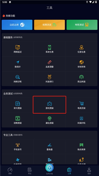 2、在工具中,找到并点击游戏测速功能