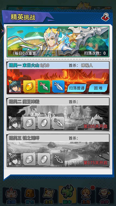 【精英挑战】1、精英挑战提供无限制的每日进入次数,玩家可享受每日两次扫荡机会。