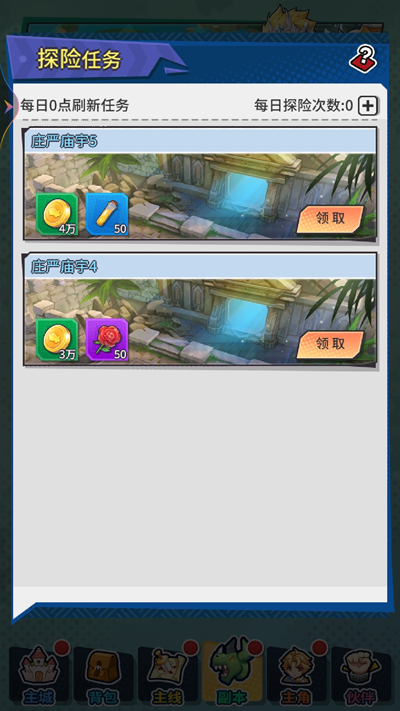 1、指定时间内完成探险任务可获得丰厚奖励,同一英雄同时只能执行一项任务。