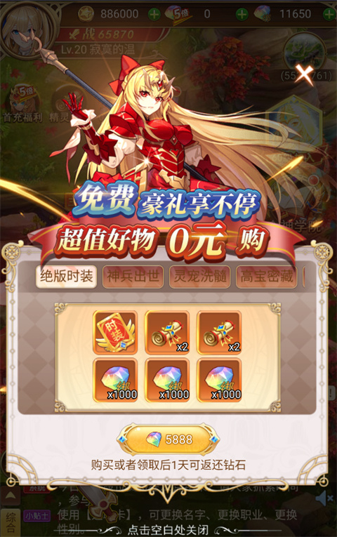 守护英雄传说0.1折是一款二次元风格的放置策略手游,游戏的主题以北欧神话故事剧情进行展开,整个画面风格采用了经典的西方魔幻元素,你将在不断冒险的旅途中去结识一个个知名的神话人物,如太阳神阿波罗、海洋之神波塞冬、冥王哈迪斯等等,都将成为你麾下的一员,去帮助你进行战斗!整个游戏玩法元素非常丰富,集合了战斗、放置、收集、宠物、转职、锻造等多个系统,在完成新手任务之后你就能不断收集资源进行养成了!考虑到玩家们前期对于各种养成资源的需求,此次小编特地带来的是这款守护英雄传说0.1折版本,其中所有的金币、钻石等资源都是能够直接以0.1折扣进行购买的,而且开局还会赠送海量的元宝以及钻石资源,玩法不肝不氪,更有首充福利、0元礼包以及其他诸多好礼等你领取,快来本站进行下载吧!