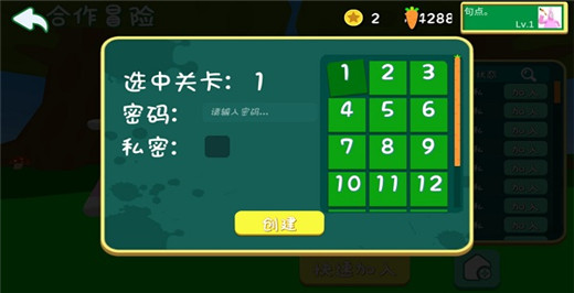 2、在该模式下右下角有一个带有“+”号的房子图标,点击即可创建房间,在此你可以选择关卡,也能输入密码以供好友进入。