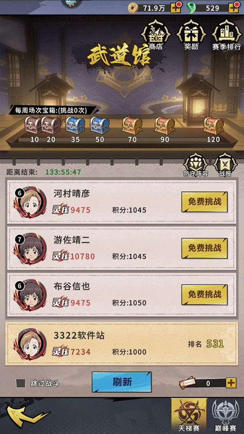 死神武道馆是玩家与玩家的对战系统,在挑战前,可以查看被挑战者的上阵英雄,从而调整自己的阵容。在挑战成功后自己将会自动提升排名。在武道馆排名前128的玩家将自动参与巅峰赛的比赛,领取独一无二的奖励。