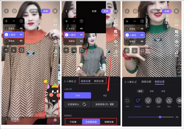 (4)在人像层,使用双指缩放调整人物大小,长按拖动调整位置,设置画面和美颜效果