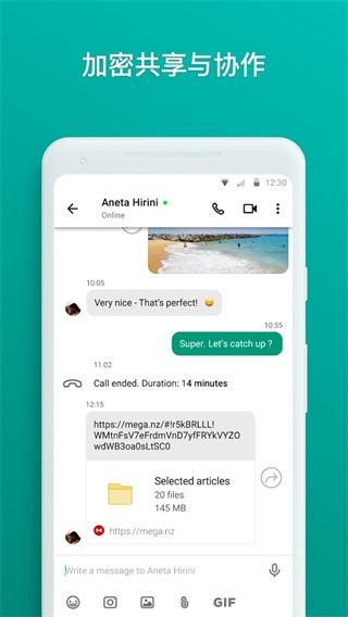 1、提供端到端加密的安全聊天功能,支持视频和音频通话,确保通讯隐私。2、聊天记录可在多个设备间自动同步,并支持在聊天中添加文件或从云盘添加。