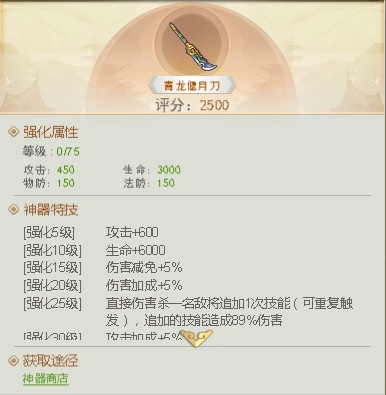 关羽的专属神器提供了强化属性和特殊BUFF,使其在战场上更具威胁性,尤其在升级至高级后,其技能效果和战斗表现将更加出色。