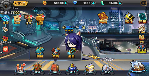 点击屏幕下方背包,即可查看装备、技能、道具信息。