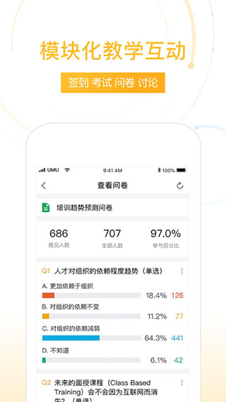 UMU互动平台官方版是一款在线学习教育平台,清新的设计风格页面,让用户在操作过程中感到轻松愉悦。简洁明了的界面布局,用户能够迅速找到想要的功能,提升学习效率。即使是新手使用这款APP,也能快速适应。帮助教师轻松教学,使学习过程更加生动有趣。无论是企业培训还是学校教学,每个人都能使用这款APP参与学习。AI分析系统能够根据学生的学习进度和表现,为他们提供个性化的学习建议。通过智能分析学生的作业情况,能够精准地指出学生的不足之处,并推荐相应的练习帮助他们弥补劣势。