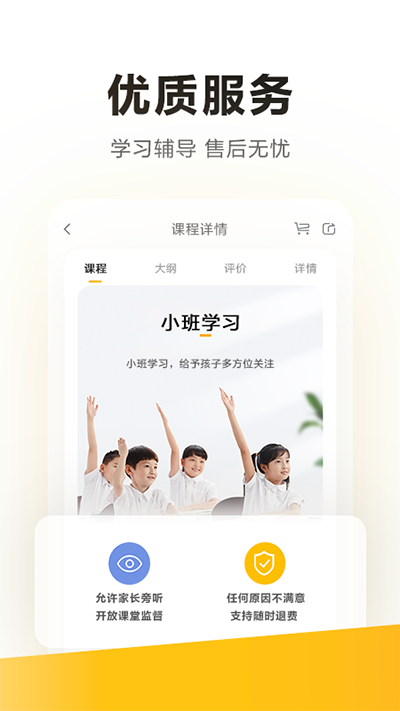 家长可以听老师的课,看看教学质量怎么样。如果有什么不满意的地方,随时可以申请退款,服务特别到位。