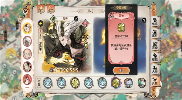 灵根变异推荐金系,增加速度和暴击率;变异密藏建议选雷池或主要使用的技能密藏。